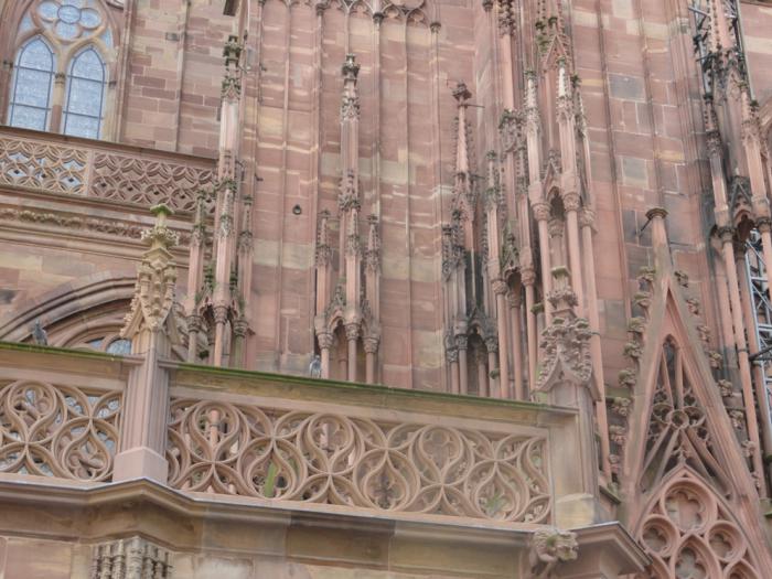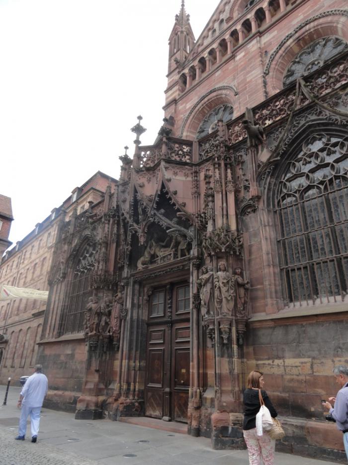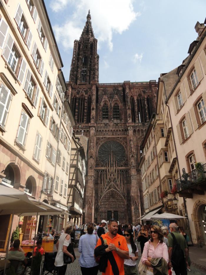 Собор возвышается среди средневековых домов центра Страсбурга как мамонт на цветочной клумбе. Он огромен настолько, что нормально не помещается ни на одну фотографию – только если с фасада, но и то с трудом.