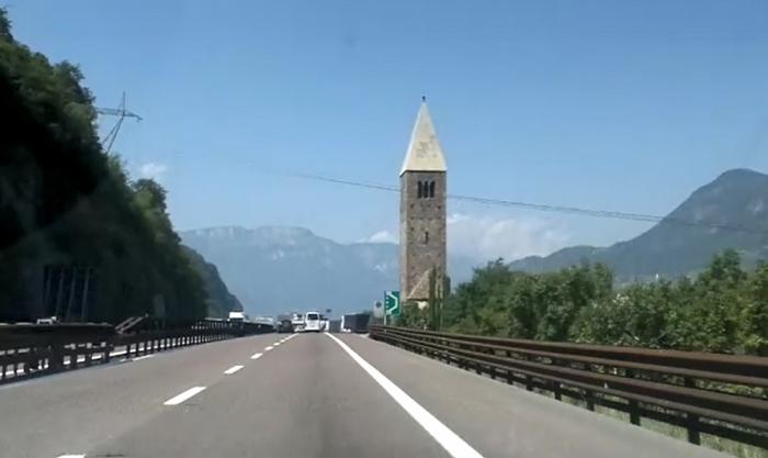 Что это именно Италия, видно только по указателю. А так – та же долина, только плавный подъем сменился плавным спуском, та же среднеальпийская архитектура придорожных деревень.