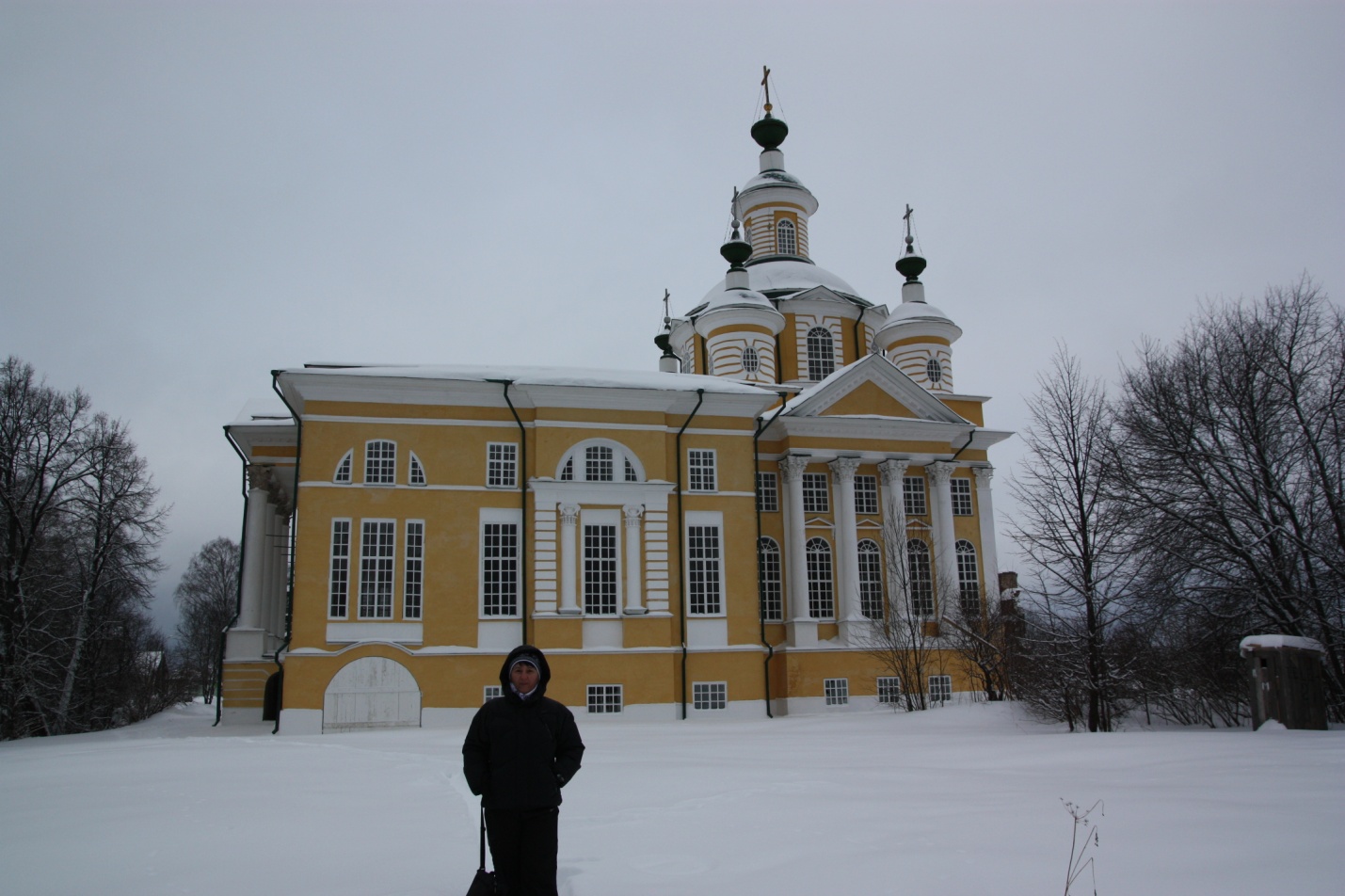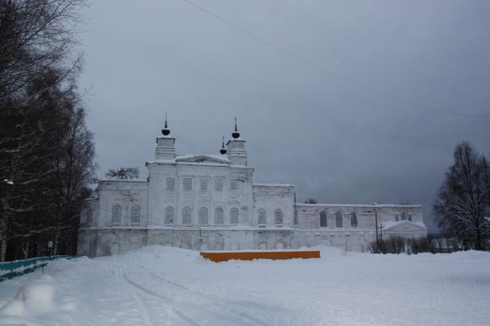 На улице легкий морозец, снежок, пасмурно. Прямо от отеля виден силуэт церкви входа в Иерусалим (1774-1794 г.г.). Поехали в Тотьму в направлении церкви. Машины оставили около гостиницы «Рассвет». Весь город в снегу, неторопливо ходят люди, проезжают машины, изредка собака пробежит по своим делам. Обычная сонная жизнь провинциального городка. Не верится, что в 18 – 19 веках здесь бурлила жизнь, в городе было множество ремесленников, торговцев, купцов, шумели богатые ярмарки, по Сухоне вниз в Великий Устюг и вверх в Вологду сновали пароходы, дощаники, лодки.