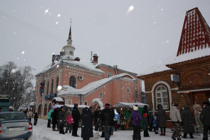 Температура минус 2 градуса. Погода нелетная, с неба непрерывно сыплет снег, который не дает возможности полноценно фотографировать. И видимость плохая, и снег все время норовит растаять на объективе. Но во всем остальном чувствуется праздник: великое множество туристических автобусов из Ярославля, Костромы, Москвы, Вологды, Череповца и прочих городов, оживленные толпы взрослых и детей, которые мельтешат по улицам, киоски с сувенирами, местные мастерицы со своими товарами. Тут же толпа людей около почты Деда Мороза, детишки размахивают руками с зажатыми в них конвертами. Под ногами бесстрашно снуют голуби, охотно принимают угощение из рук и не боятся людей.