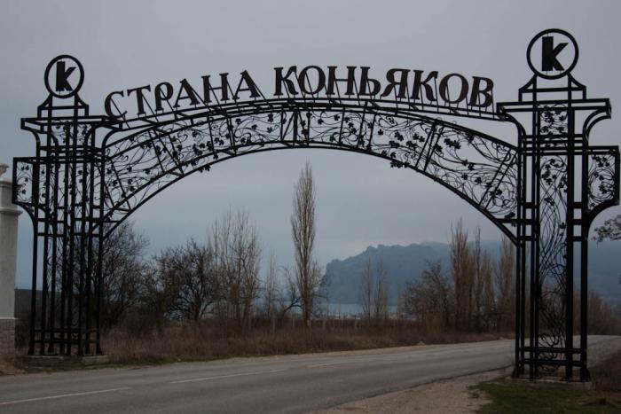 Движемся в сторону Судака. На пути Коктебель – страна коньяков (через такие ворота проезжаем). Не можем удержаться и не заехать на винный завод и прикупить вина (25 гривн за литр) и коньяк.