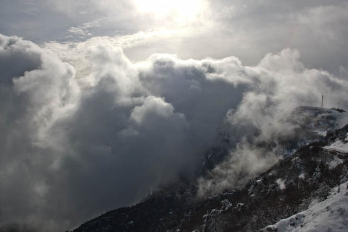 Едем на канатку на Ай-Петри. Поддаемся на уговоры местных поднимаемся на гору на такси. 24 км дороги – горный серпантин. После водопада Учан–Су дорога становится снежной, а местами ледяной. На дороге стоят ДАИшники и пытаются развернуть желающих подняться в горы. На горе температура нулевая, много снегу, предлагаются все зимние развлечения: лыжи, санки, снегоходы, лошади. Крымчанам должно быть интересно, у них снег только здесь, а нас особо не впечатляет. Спускаемся на канатке: она старинная, маятниковая, в вагончик набивается человек 25-30.Спуск или подъем стоит 50 гривн на человека – не дешево.