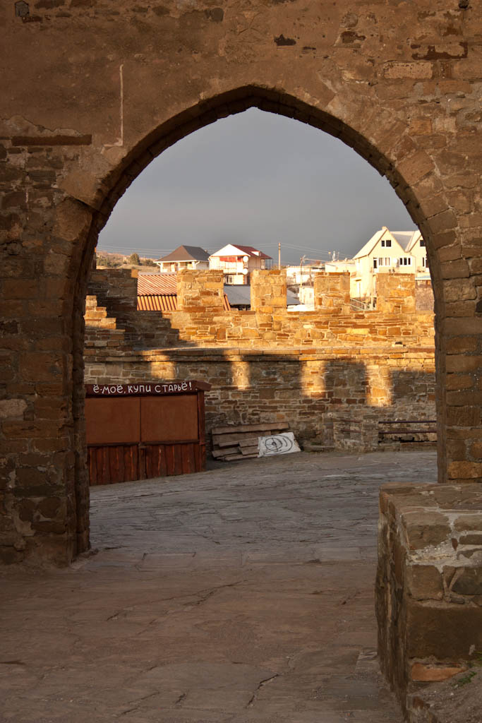В Судаке едем в старинную крепость, здесь сейчас музей (40 гривн билет), обходим огромную территорию, лазаем по башням. В самую высокую – Дозорную дорога закрыта, написано «Опасно». Виды сверху открываются изумительные – закат солнца.