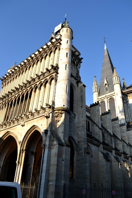 Поразил Собор Богоматери (Église Notre-Dame de Dijon). Эта церковь с причудливым фасадом в итальянском стиле одна из самых необычных в Дижоне. Она была построена в первой половине 13 века, и, по замыслу неизвестного архитектора, на ее фасаде разместилось множество скульптур гаргулей. В отличие от большинства других церквей, где подобные скульптуры служат своего рода водостоками, в церкви Notre-Dame они с самого начала выполняли только декоративную функцию. Однако еще до окончания строительства одна из скульптур упала и убила одного из горожан. Жители города были так возмущены этим событием, что потребовали снять все опасные скульптуры с фасада церкви. Церковные власти вынуждены были согласиться. Лишь в 19 веке было решено вернуть церкви первоначальный облик и воссоздать 51 снятую скульптуру.