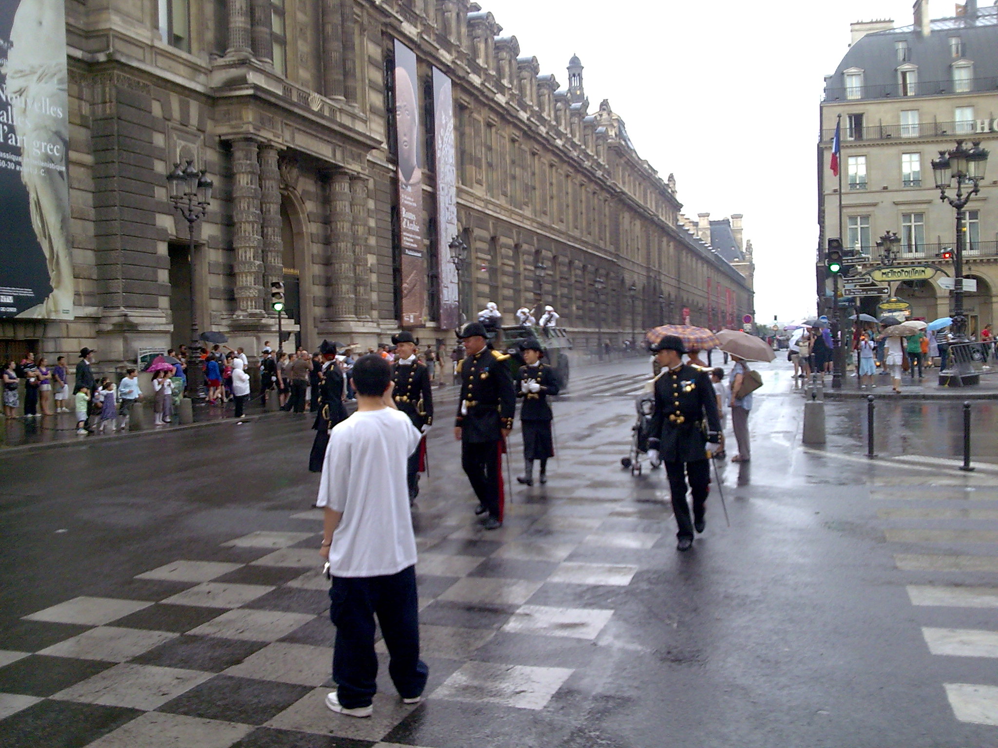 В сам Лувр не пошли, за отсутствием времени, сфотографировались возле Лувра и пошли к Ласточке, и тут нас и застиг парад военной техники, и ливень, далее шедший весь день с перерывами.