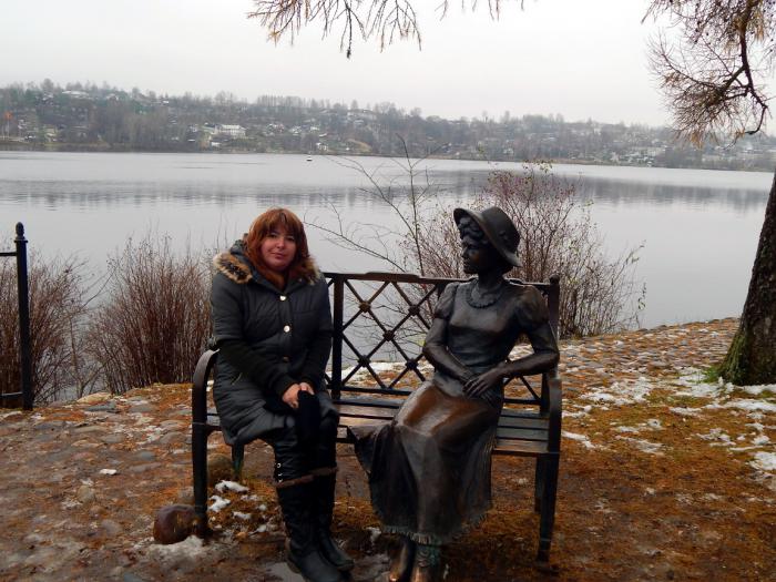 Здесь пришла в голову неожиданная мысль — «А не смотаться ли в Плёс?», которая всем пришлась по душе. Дорога приличная и пустая, катить одно удовольствие. Вдоль Волги узкая набережная, почти в самом конце музей пейзажа, дамы сошли за пенсионерок, мне этот фокус не удался, поэтому прошёл за полную стоимость. На телефон можно снимать бесплатно, на фотоаппарат 100 рублей, полчаса хватило на осмотр деревенских пейзажей разных художников и разных размеров полотен. Напротив музея скульптура дамы на скамейке и рядом рама от картины, всё под бдительным присмотром местного кота.