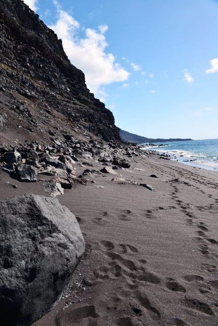 Arenas Blancas – пятидесятиметровая полоска относительно белого песка. Добравшись по укатанной грунтовке почти до самого пляжа, оставляем машину и начинаем исследование этой части берега. Позади хорошо виден почти весь остров с долиной Эль Гольфо, на склоне – уже знакомая нам Сабиноса, ниже нее – отель и источник Pozo de la Salud.