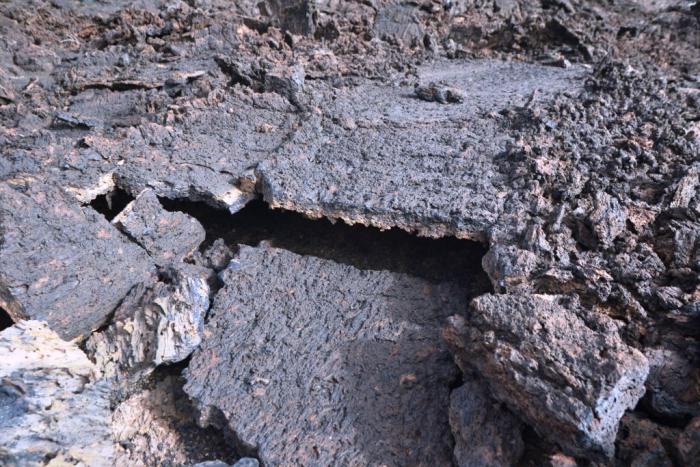 Кое-где наблюдается совершенно непонятное явление: как будто кто-то прошелся по еще горячей лаве бульдозером, выровняв целые дорожки в породе.