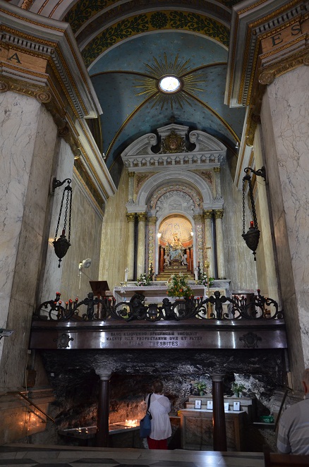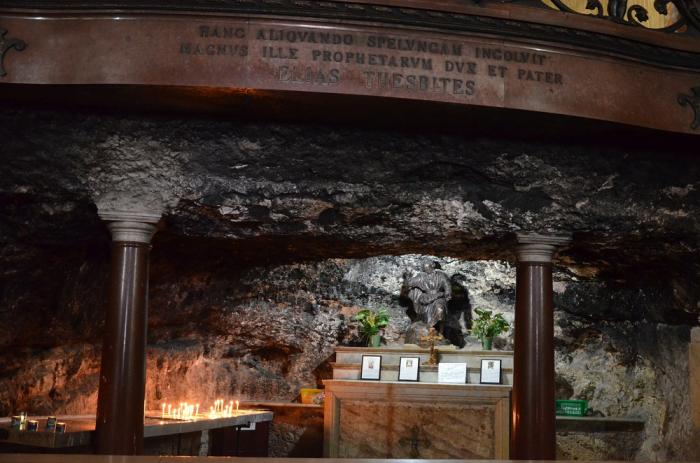 Из залы спускаются ступени к высеченной пещере, в которой расположен деревянный алтарь, а над ним статуя Ильи (две последние фото)- кармелиты верят, что именно этот грот служил временным убежищем пророка Илии, спасавшегося от мстительного царя Ахава и его жены Иезавель.