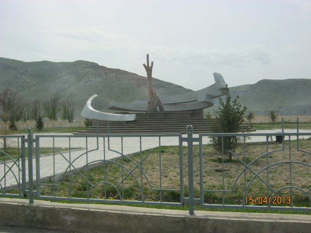 Подъезжаем к месту, где была наша воинская часть…Там и сейчас стоят военные вертолётчики. Узнаю КПП, казармы, штаб. Далее развилка на Семей и Ушарал. В этом месте установлен гигантский постамент воину Кабанбаю Батыру.