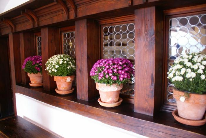 Везде расставлены горшочки с цветами: