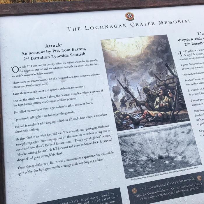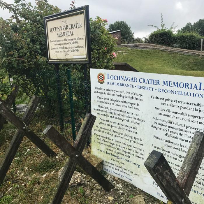 Лохнагарский кратер — воронка глубиной в 35 метров, образовавшаяся на месте подрыва укрепленных немецких позиций в первый день битвы на Сомме. Английские шахтеры подкопались под немецкий укрепрайон и натаскали туда несколько тонн взывчатки. Рвануло так, что, говорят, было слышно в Лондоне.