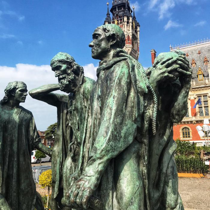 Эти унылые персонажи олицетворяют собой местных знатных горожан, которые добровольно сдались на милость английского короля Эдуарда III, осаждавшего Кале в ходе Столетней войны. Персонажи преисполнены скорби, потому что понимают, что идут на смерть. Именно этот момент пытался передать автор. Однако впоследствии английский правитель все же смилостивился над ними и даровал жизнь. Но это уже другая история.