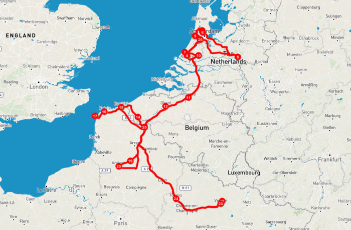Маршрут передвижения мы планировали по обратному принципу: решили НЕ ехать в Германию и Париж. Так возможный круг стран и очертился сам собой: Голландия, Бельгия и север Франции. В качестве точек постоя (кроме самого Амстердама) были выбраны бельгийский Антверпен и французский Лилль. Экскурсионную программу набросали крайне плотную и насыщенную: каждый день предстояло куда-то ехать или бежать. Нас ждали пряничные голландские и бельгийские городки, а также места боёв Первой мировой войны в Бельгии и Франции.