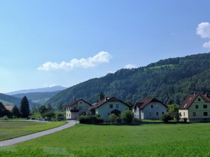 Потом были тоннели, самый длинный около 3-х км. Один раз наш навигатор увел нас с автобана и мы попали в австрийские деревушки у подножия Альп. Красота неописуемая. Чистота, покой и умиротворение. Очень милые домики, лужайки, никаких тебе заборов. На полях пасутся коровки, ляпота.