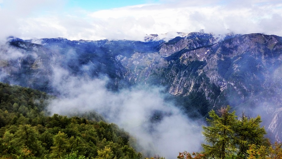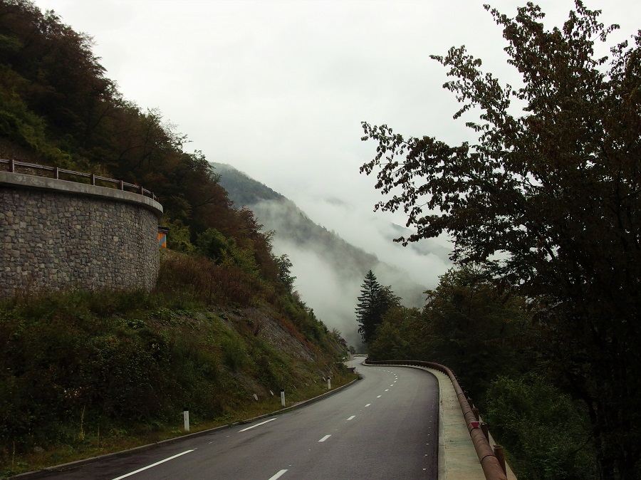 Он нас уводит сначала в деревеньки у подножия Альп, а потом мы понимаем, что начинается подъем в горы и вот уже страшный горный серпантин. Хорошо хоть прекратился дождь. И вот мы всё выше и выше и выше, уши заложило, дорога узкая, но покрытие идеальное (даже в горах!!!), вниз смотреть страшно, высота такая, аж жуть, даже облака были ниже нас. Но несмотря на это, пару раз остановились полюбоваться красотами, вдохнуть упоительного свежего воздуха и сделать пару снимков.