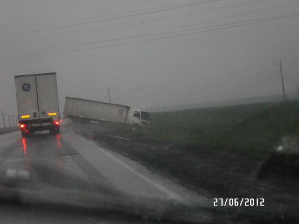 Было видно как впереди стоянка для машине просто была похоже на озеро, сбоку машины оказались вообще отрезаны от дороги. Короче в том момент мне было страшновато. Фуры пытались проехать, но застревали посреди потока, один грузовик вынесло и развернуло полностью. Полный ужас. Через полчаса полного ливня, люди перестали выдерживать. Мужики стали выходить под этот дождь и пошли смотреть что происходит и что делать дальше (так как машин скопилась более 50 уже с обоих сторон этого перевала). Как позже выяснилось – часть дороги размыло потоком воды, и под этой водой не было видно булыжников. Мужики по колено в воде выкидывали эти камни и расчищали дорогу. Где-то через 2 часа потихоньку начали самые смелые преодолевать это препятствие. Мне, правда, было страшно, но муж тоже решил ехать. Пятиминутка с видеорегистратора скинута в майле (можно посмотреть там, кому интересно будет, там немного видно как смывает машины потоком воды). Потихоньку проехали этот дурдом и мы, хотя чувствовалось, как машину чуть ли не смывает за обочину потоком. Естественно было не до сна, проехали уже 4100км. И нет чтобы остановится и отдохнуть после приключения, нет же, нас понесло дальше и не проехав пару часов мы пробили колесо на машине. Пришлось ставить банан и возвращаться назад в кемпинг на ремонт. Вернули, заменили, но уже остались до утра там.