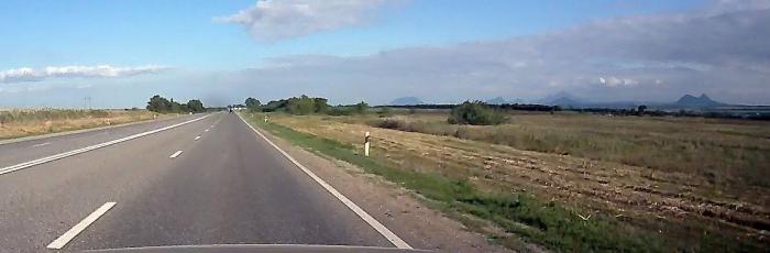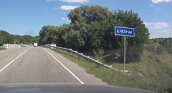 Свернув направо в станице Саратовская, мы двигались по хорошей дороге в сторону Белореченска. Местами дорога отремонтирована, но это не опасно — по ней можно ехать не сбавляя скорость. В целом это не широкая дорога, по одной полосе в каждом направлении. Если попадется какой-нибудь «тормоз», то в некоторых участках за ним придётся долго плестись без возможности его обогнать. Но нам повезло — нам такие не попадались.