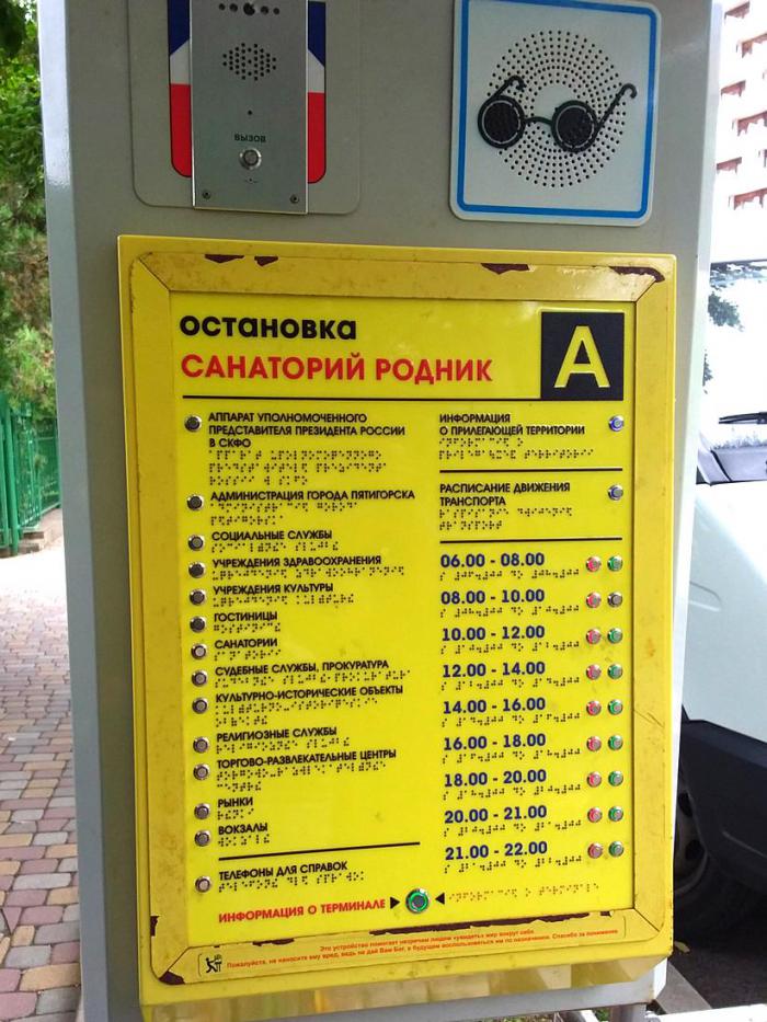 А другая, побольше парковка от Провала находится на некотором удалении, поэтому нужно набраться терпения, чтобы преодолеть это расстояние. По дороге мы увидели вот такой речевой информатор с кодом Брайля. Я такого, признаться, никогда не видел. У него не только на поверхности выпуклый код, но и кнопки, при нажатии на которые выдается звуковая информация приятным женским голосом.