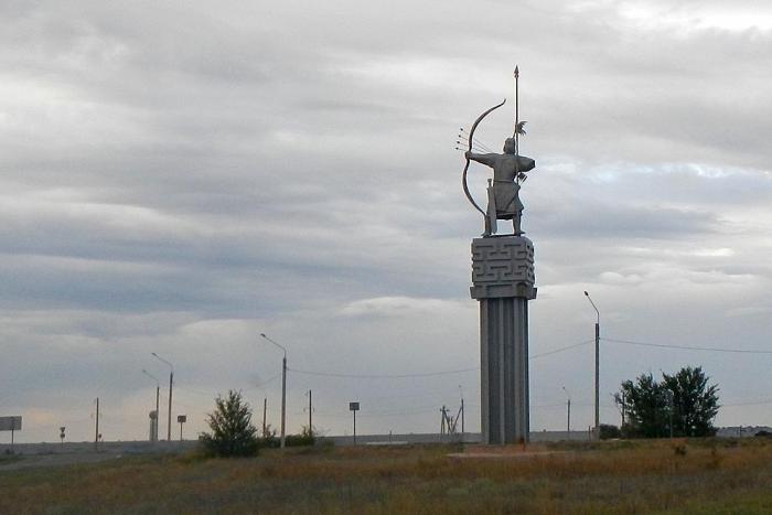 В солнечную погоду этот богатырь, покрытый сусальным золотом, наверно сверкает как второе Солнце. Глядя на эти памятники с архаичными луками и стрелами, невольно вспоминается другой «памятник» А.С.Пушкина "и друг степей". Александр Сергеевич кстати проезжал через калмыцкие степи в 1829 году. И вот, что он написал в своём дневнике: «На днях, покамест запрягали лошадей, пошёл я к калмыцким кибиткам. У кибитки паслись уродливые и косматые кони… В кибитке я нашёл целое калмыцкое семейство: котёл варился посредине, и дым выходил в верхнее отверстие. Молодая калмычка, собой очень недурная, шила, куря табак. Лицо смуглое, тёмно-румяное. Багровые губки, зубы жемчужные. Замечу, что порода калмыков начинает изменяться, и первобытные черты их лица мало-помалу исчезают. Я сел подле неё. «Как тебя зовут? Сколько тебе лет?» — «Десять и восемь». — «Что ты шьёшь?» — «Портка». — «Кому?» — «Себе» — «Поцелуй меня». — «Неможна, стыдно». Голос её был чрезвычайно приятен. Она подала мне свою трубку и стала завтракать со всем своим семейством. В котле варился чай с бараньим жиром и солью...»