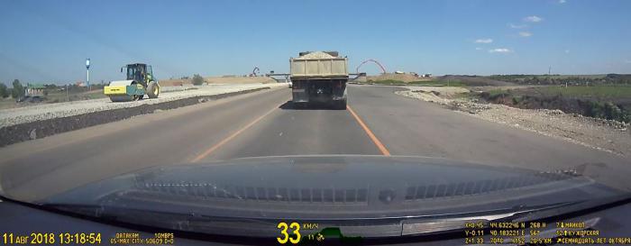 На выезде из города идет ремонт дороги. Есть временная оранжевая разметка. Очень хочется обогнать впереди идущий медленный самосвал.