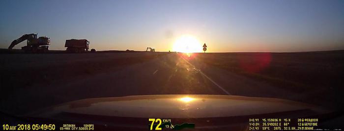 Дорога вильнула влево, и ехать опять стало не комфортно. Солнце находится над дорогой чуть выше горизонта и слепит глаза. Солнцезащитный козырек не помогает. Через полчаса оно поднялось выше и ехать стало полегче.