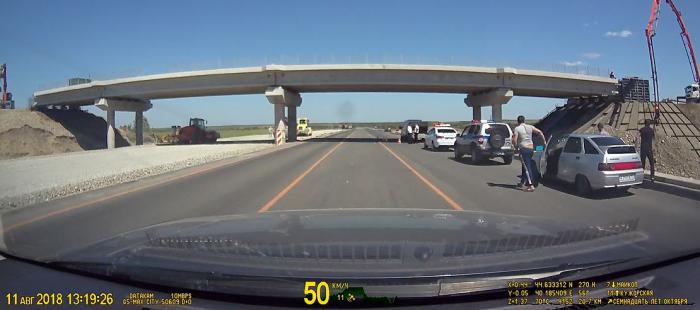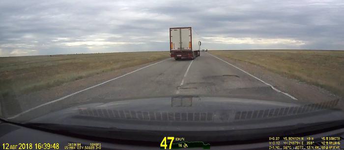 Догнав какую-то фуру, я попытался её обогнать, но она резко приняла влево, не дав себя обойти. Через мгновение я понял, она объезжала неровности на дороги. После этого мы решили не торопясь ехать за ней — "жираф большой ему видней". Эту тактику, как и Сергей, стал применять теперь и я, успевая выполнить маневр или притормозить. Через несколько километров такой езды «жираф» объехал «пятнашку», около которой угрюмо стояли парень с девушкой.