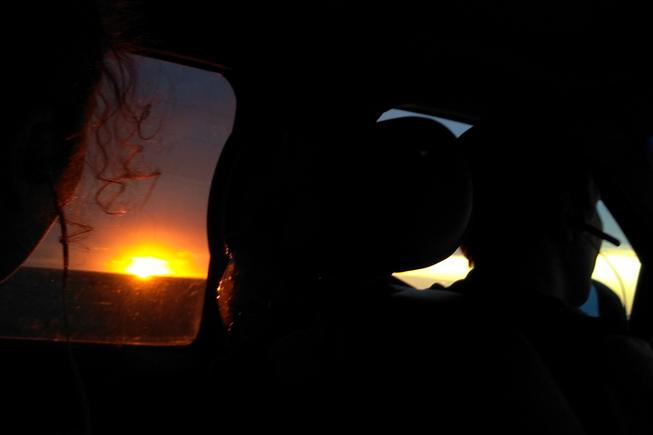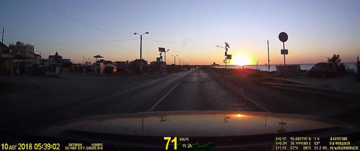 Реально хотелось спать. Это усиливалось тем, что мы не завтракали. Извилистые повороты укачивали, и дети быстро уснули. Примерно тоже самое происходило и в машине Сергея, поэтому, чтобы никого не тревожить, мы ограничили наш радиообмен. Но это продолжалось не долго, когда мы проезжали Береговое, из морской воды стало всходить солнце. Это очень красивое явление! Оно всех разбудило и придало бодрости. Я теперь жалею, что мы не остановились и не потратили 15 минут, чтобы насладиться этим явлением природы. Как тут не вспомнить слова из замечательного мультфильма: «Да, но если мы не увидим рассвет, мы можем опоздать на всю жизнь!»