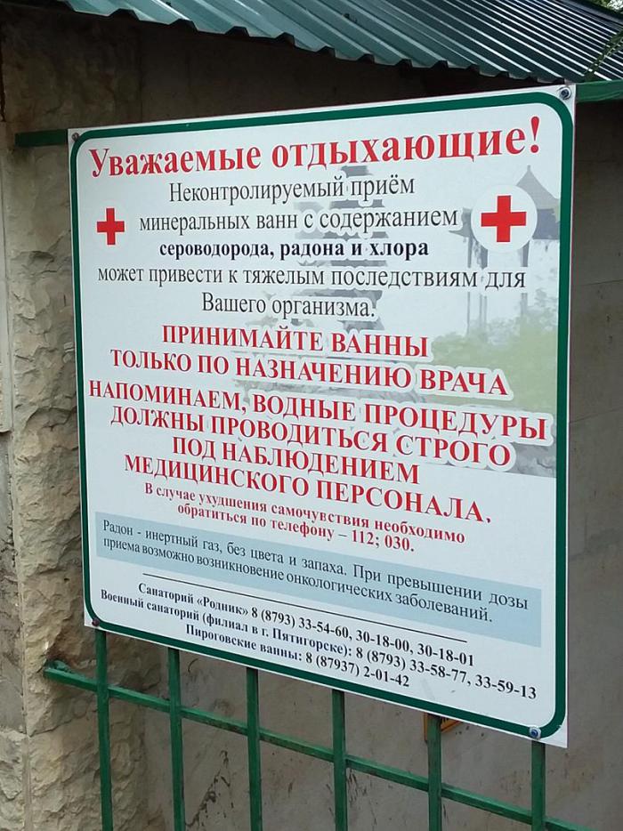 Можно сказать, что это «дыхание» горы Машук. Но нам с сыном оно определенно не понравилось. И сделав внутри несколько фотографий, мы поспешили на свежий воздух. Пребывание в подземном озере трудно назвать приятным. Мне кажется, что и на пользу оно не идёт. А вот и подтверждение «полезности» сероводородной воды.