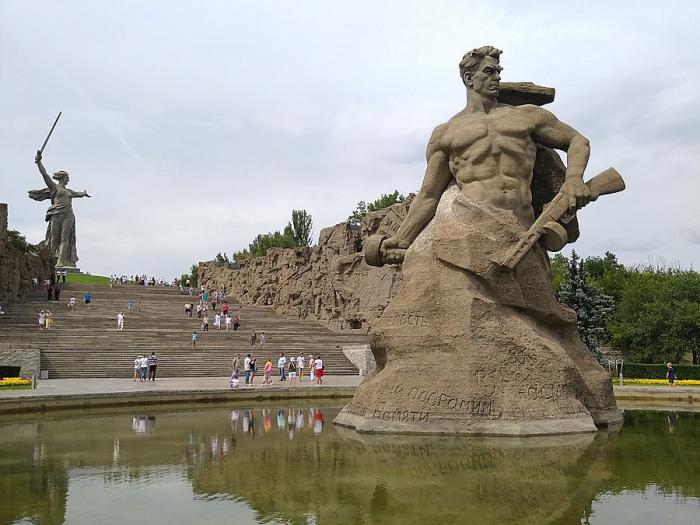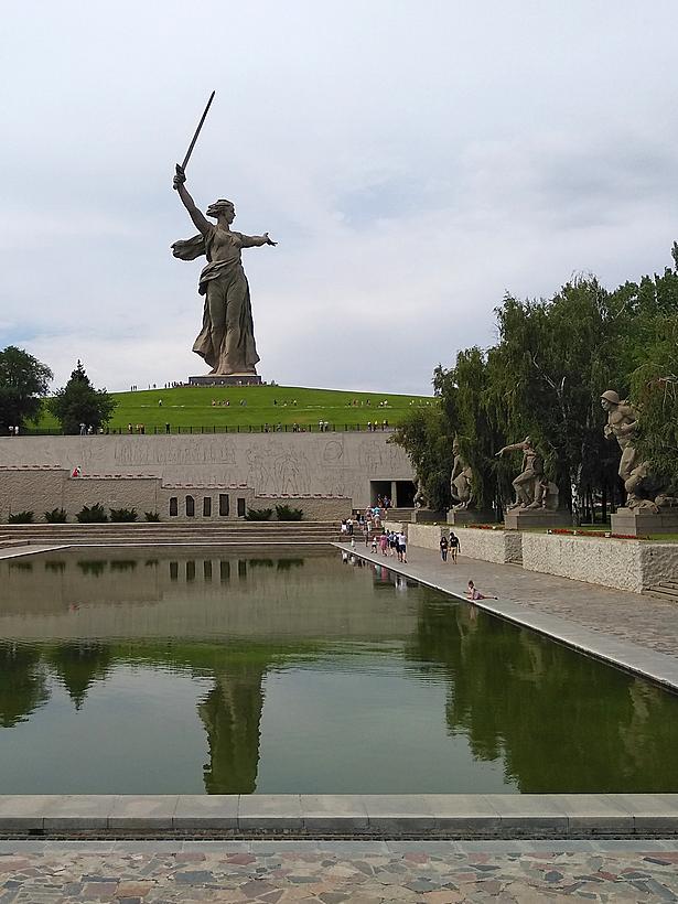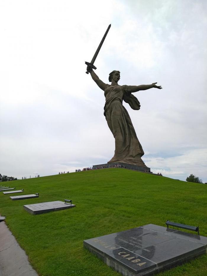Конечная точка пути – монумент "Родина-мать зовет!", композиционный центр ансамбля, высшая точка кургана. Её размеры огромны – высота фигуры составляет 52 метра, а общая высота Родины-матери – 85 метров (вместе с мечом). Это в 30 раз выше человеческого роста.