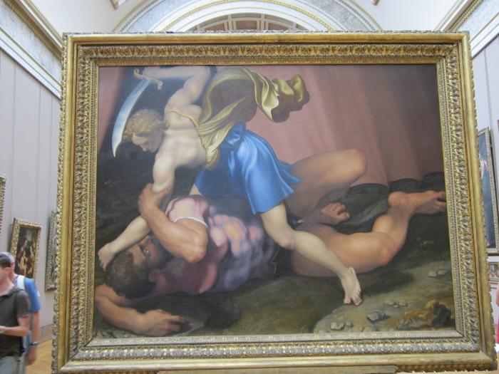Мона Лиза за бронестеклом. Часть толпы фотографирующих. Некоторые картины. Фотографировать сложно, очень бликуют. Сразу узнал «Давида и Голиафа», возгордился ужасно- хоть что-то знаю…