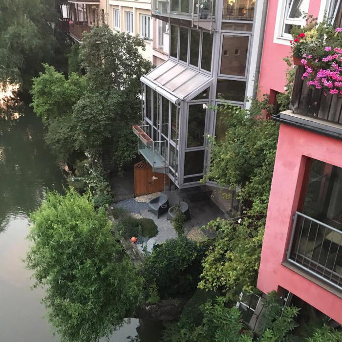 Впрочем, тогда мы об этом не думали, а просто наслаждались окружающей действительностью. Особенно хорошо радоваться жизни, поедая свежие фрукты, купленные на местном рынке, разбитом на одном из мостов через Пегниц. Между палаток была смотровая площадка откуда открывался вот этот, простите за тавтологию, открыточный вид: