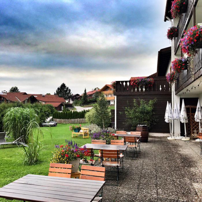 Это был, пожалуй, один из самых колоритных и красочных отелей на нашем маршруте. Гостевой дом Hotel Alpenblick Berghof в красивой и тихой деревушке в 10 километрах от замка Нойшванштайн. Шикарнейший вид на Альпы, уютный дворик и гостиная. Приятный бонус — местное бутылочное пиво по гуманным для отелей ценам. :)