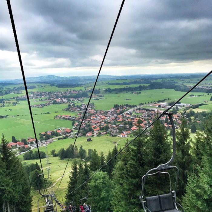 После обязательной для этих мест экскурсионной программы, мы еще успели заехать на местную канатную дорогу. Поднявшись по ней, мы смогли еще раз окинуть взглядом округу. Баварские предгорья — это, конечно, что-то! Наверху нами была обнаружена группа любителей экстремальных видов спорта, спускавшихся с гор на парапланах. Вдохнув свежего альпийского воздуха на высоте, мы вернулись обратно к шоссе.