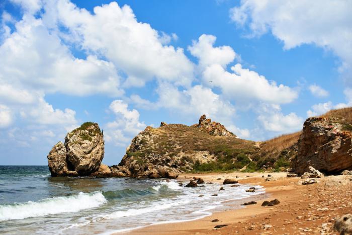 Но по пути у нас намечена ещё одна живописная промежуточная точка — мыс Зюк (GPS: 45.48227, 36.34125). В посёлке с говорящим за себя названием Курортное, сворачиваем направо и по пыльной грунтовке выезжаем к скалистому берегу моря.