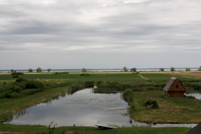 Она вместе с мужем – Янисом – управляет гостевым домом «Zvejnieki» (Рыбаки). Где нас накормили вкусным обедом. Уха, копченая рыба, домашний сыр, свежий хлеб и овощи. Хотя мы не сильно проголодались, после обильного завтрака и дегустации пива, но обед съели с удовольствием. Янис рассказывал нам смешные истории и потчевал домашними настойками. За шутками и рассказами мы поняли, что хозяин любит и знает историю родного края и умеет в интересной форме донести свое восхищение до слушателя. Интересно, то, что часть построек крыто тростником. Янис нам рассказал, что тростник лучше современных кровельных материалов. И он планирует перекрыть крыши тростником на всех хозяйственных постройках. Рядом с домом стоит памятник комару, единственный в Латвии. По словам хозяина, комары стали меньше кусать постояльцев после установки.