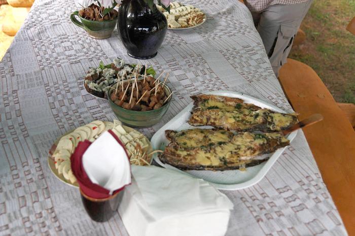 Около шести вечера (время местное) мы приехали в гостевой дом «Rūķīši» (Egļusala, Rugāju pagasts. Координаты: 57°0'1.8" N, 27°7'42" E), где у нас был запланирован ужин. Лучи вечернего солнца освещали идиллическую картину. Несколько гостевых домиков на берегу пруда, травка ровно подстрижена. Захотелось искупаться и растянуться на травке, чтобы отдохнуть с дороги. Но нас уже встречала радушная хозяйка в национальной латгальской одежде и рюмкой шмаковки. Шмаковка – местная водка, которую в каждом доме делают по собственному рецепту. Нас не стали мучить долгими приветственными речами, а сразу посадили за стол.
