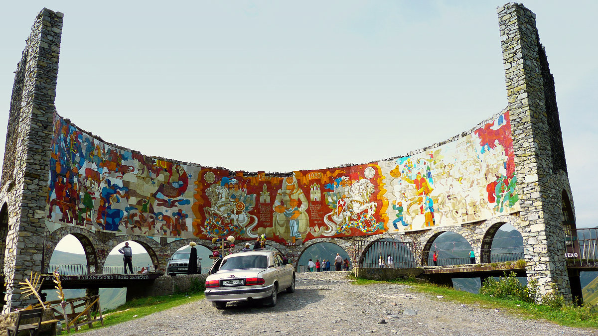 Она построена в 1983 году, к 200-летию подписания Георгиевского трактата. Согласно этому документу Грузия добровольно переходила под протекторат Российской империи. При этом в Грузию назначался российский генерал-губернатор, который не лез во внутреннюю жизнь грузинского общества, а курировал оборону, правопорядок, образование. И хорошо грузины жили «под Россией», и некоторые из них даже весьма преуспели на государевой военной службе: князья Багратион, Дадиани, Цицианов. На внутренней поверхности этого сооружения, которое символизирует дружбу грузинского и русского народов, выложено мозаичное панно, на котором показана вся история Грузии от «дотрактатных времён» до современности, то есть до конца ХХ века. Есть и революция, и социализм, и знаменосец Победы Мелитон Кантария.