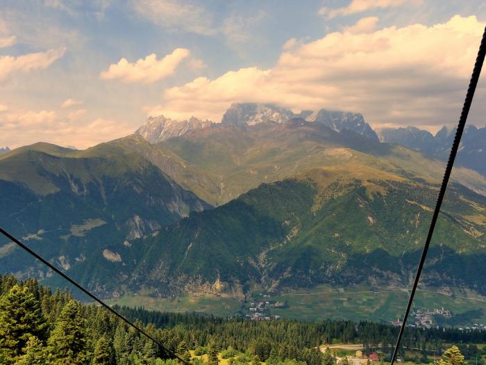 После музея едем в аэропорт. Пересекаем по необычному мосту реку Ингури. Неожиданно у дороги возникает рекламный щит с ГЛАВНЫМ СЛОВОМ ДЛЯ ТУРИСТА В ГРУЗИИ:«ГАМАРДЖОБА!!!» По-грузински это означает «здравствуйте». Начинайте разговор с этого слова — и с вами в Грузии всё будет хорошо!!! ОДИННАДЦАТЫЙ ДЕНЬ путешествия мы провели в Местиа. Нашли канатную дорогу в местечке Хацвали и поднялись с её помощью на вершину горы. Там обнаружилось кафе с большой круговой террасой. И мы долго ходили по ней, любуясь видами гор и других окрестностей.