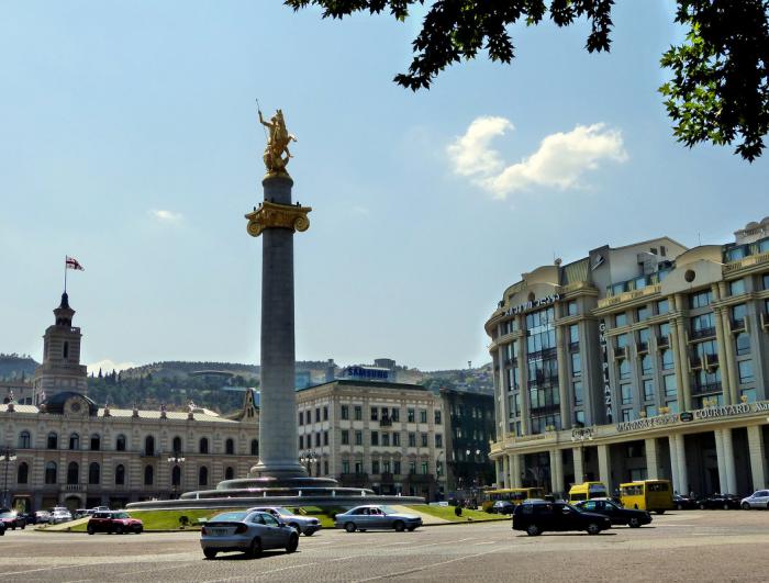 Здесь мэрия Тбилиси (с флагом). Справа на фото гостиница «Кавказ» и примыкающее к ней здание Управления кавказских войск (во времена Российской империи). Напротив мэрии сквер Пушкина с памятником великому русскому поэту. А в центре площади колонна с