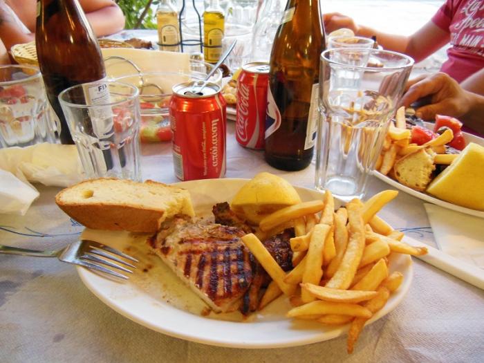 У нас были только завтраки. Обедали и ужинали в кафешках в городе за 50-70 евро на пятерых. Бывало не обедали вовсе или в номере. Далеко ходить не хотелось. Было жарко +31, +34 и т.д. В местном ресторане ужинали один раз — не понравилось. Еда — стандарт. Хотелось чего-то такого...