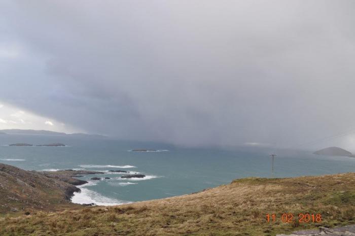 Погода правда ветренная, небольшой плюс и временами снежные заряды. Т.е. типично переменчивая по-ирландски. Мы останавливались на различных смотровых площадках. На побережье ветер крепчал. А над водой местами шёл дождь.