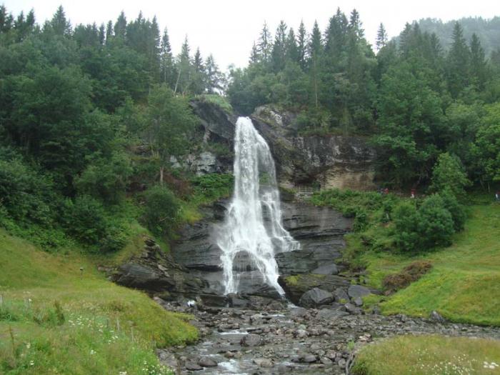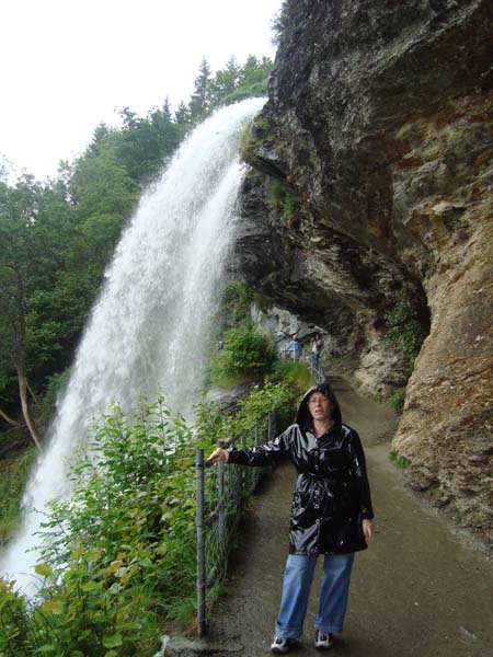 Погода очень испортилась. Когда мы выехали из города, накрыл сплошной дождь и туман. Поэтому красивую дорогу RV7 мы не очень прочувствовали. Но по дороге мы заехали к водопаду Steindalsfossen (N60*22'13" E006*06'14"). Водопад интересен тем, что тропинка, идущая к водопаду заходит прямо за поток. Но вот меч на скале, который должен быть около водопада мы не увидели. Может его сняли?
