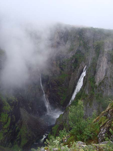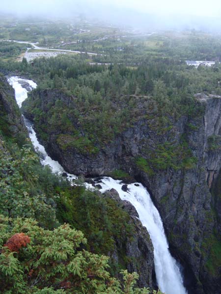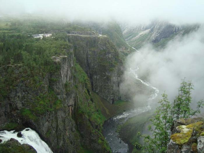 Водопад Vøringfossen – четвертый по высоте в Норвегии, его образует река Бьорейя (Bjoreia), падающая с высоты 183 метров (включая 145 метров свободного падения). Водопад такой высокий, вернее глубокий, что он никак не умещается на фото. Ущелье какое-то мрачное, от него веет опасностью.