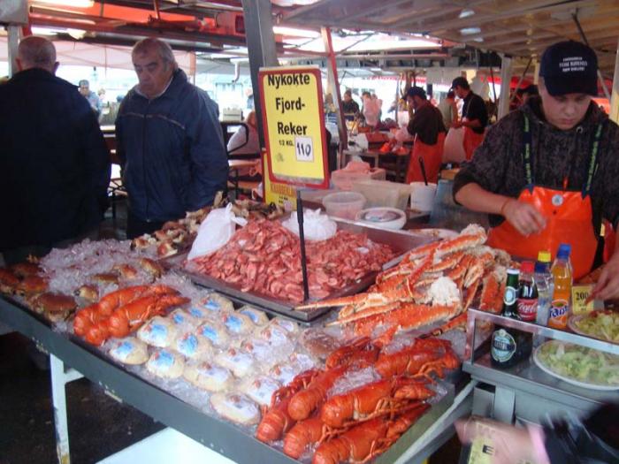 После музея мы вернулись на набережную к знаменитому рыбному рынку. Действительно, как писали многие, это слишком раскрученный бренд Бергена. Но тем не менее, мы купили контейнер, утрамбованный морепродуктами и салатом.
