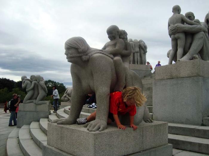 Мы устроились, переоделись, пообедали и пошли гулять по городу. Так как знаменитый Vigelandsparken (Парк скульптур Вигеланна) находился буквально в 10 минутах ходьбы от отеля, то мы туда и направились. Я зимой там уже была, но еще раз не прочь посетить. А Никита тем более в Осло первый раз. Зимой, конечно, было намного меньше народа. А летом – просто тьма! И опять невоспитанные представители азиатских стран облепили все, что можно, да так, что сфотографировать ничего невозможно.