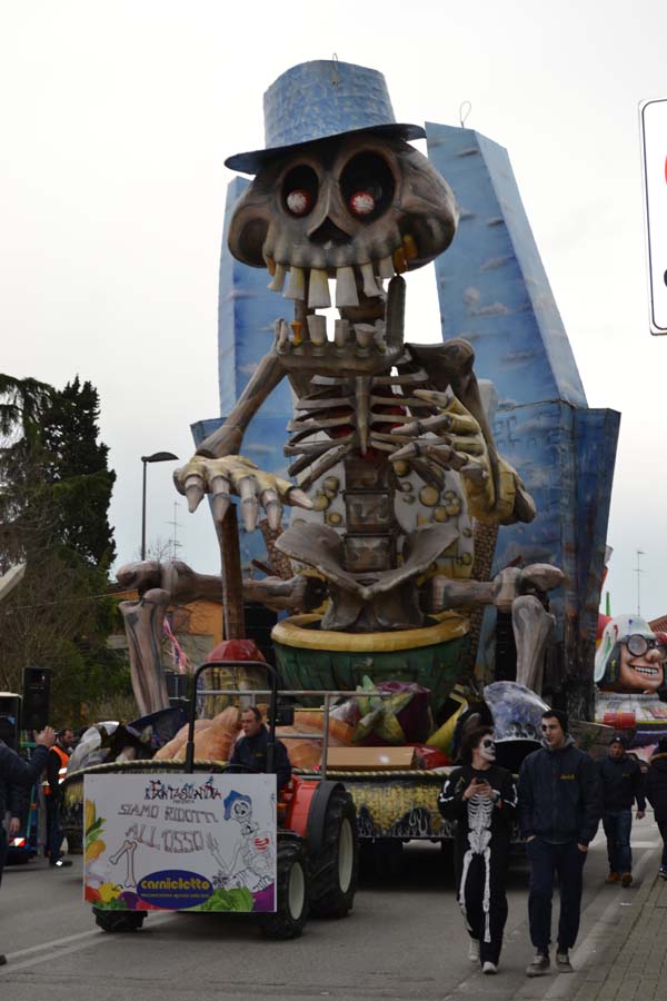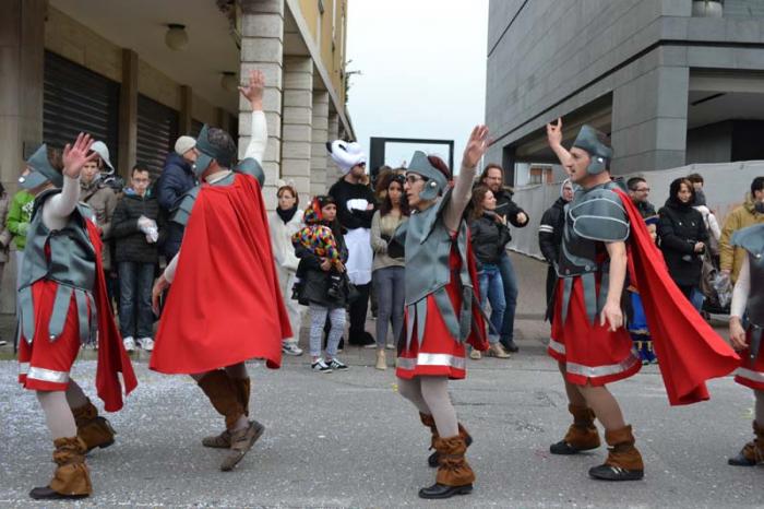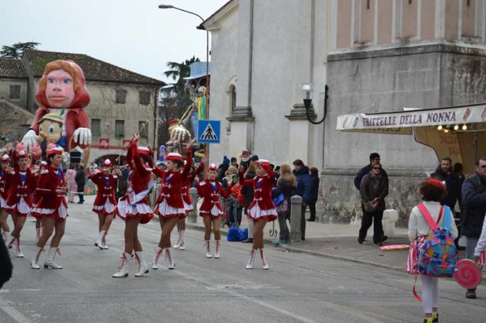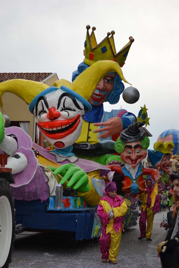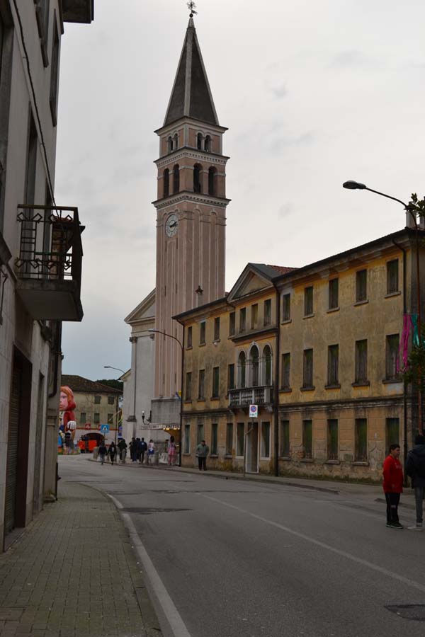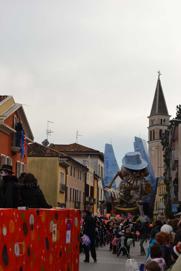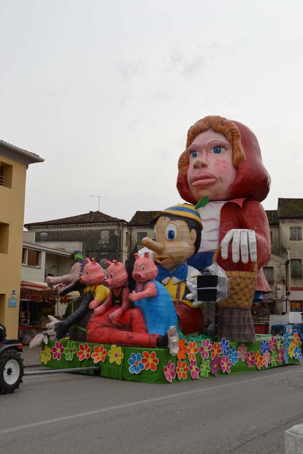 Зато благодаря моим итальянским друзьям, я узнала, что карнавал – это не только Венеция. Я побывала на шествии платформ в городке Ceggia. Это всего минут 15 на электричке от городка, где я жила. Можно доехать и на автомобиле. Только надо знать, что его придется оставить далеко от центра. Все оцеплено, пройти можно только пешком, вход платный, 6 евро. По главной улице, начиная от церкви, проходит парад платформ. Каждая коммуна целый год за счет спонсоров строит эти платформы, придумывает представление и во время карнавала это показывает на шествии. Участвуют и дети, и взрослые. Очень забавно было смотреть, как солидные дяди в костюмах пингвинчиков самозабвенно стараются выполнить нужные движения под музыку.