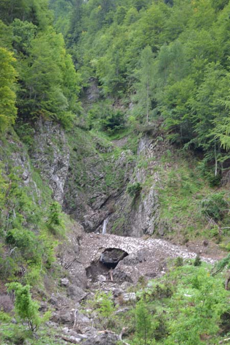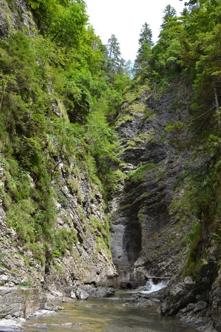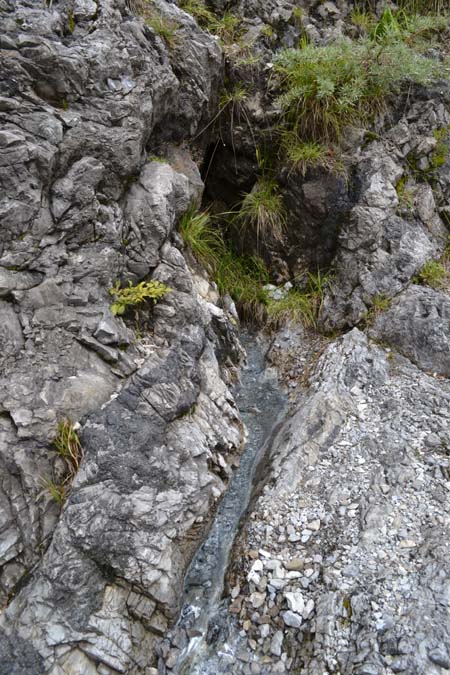 Недалеко от стоянки видим красивое узкое ущелье, откуда вытекает река и слышно шум водопада. Если есть резиновые сапоги, то можно пролезть туда подальше и все увидеть, но в ботинках не получилось.