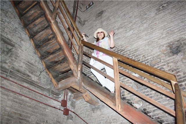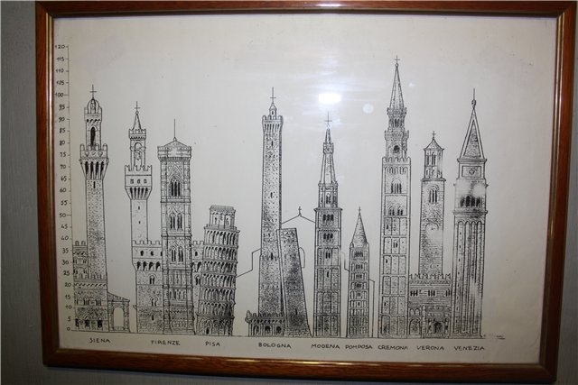 А мы, тем временем, слегка запутав в узких улочках, приближаемся к нашей первой высоте. Башня Асинелли. Высота 97 метров с копейками. Внутри 498 отполированных тысячами человеческих ног ступенек. Велкам! Башня Асинелли с Башней Гарсиенда образуют символ Болоньи. Башня Гарсиенда падает. Вообше, это заблуждение считать, что в Италии падает только Пизанская башня. Там ни одной ровно стоящей нет. Сам видел. Асинелли тоже падает, но строительство Гарсиенды перкратили, когда поняли, что она рухнет, если продолжать ее строить. Внутри башни Асинелли есть небольшой высотомер, показывающий высоты более «мелких» башен, распооженных на Аппенинском полуострове. Есть так же фотография средневековой Болоньи, на которой Башни торчат, как зубы у акулы. В Средние века в городе было построено окоо 200 башен. Каждое семейство строило свою башню. Я так понял, что они там башнями этими мерились между собой.