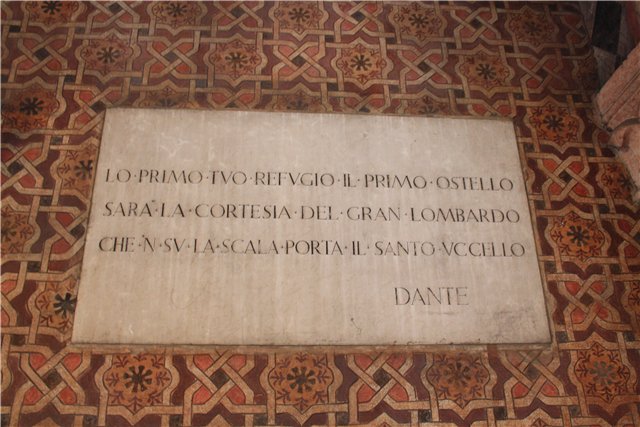 Сами Арки это саркофаги трех представителей семейства Скалигеров, правивших Вероной в период ее расцвета. Под портиком напротив Арок мы на стене находим цитату Данте. Кангранде I из рода Скалигеров приютил его в период изгнания из Флоренции. Кстати, божественная Комедия писалась примерно в это время. С 1306 по 1321 годы. А Данте изгнали в 1304-м. Ни арки Скалигеров, ни сама площадь не могут нас заинтересовать так, как башня Ламберти.
